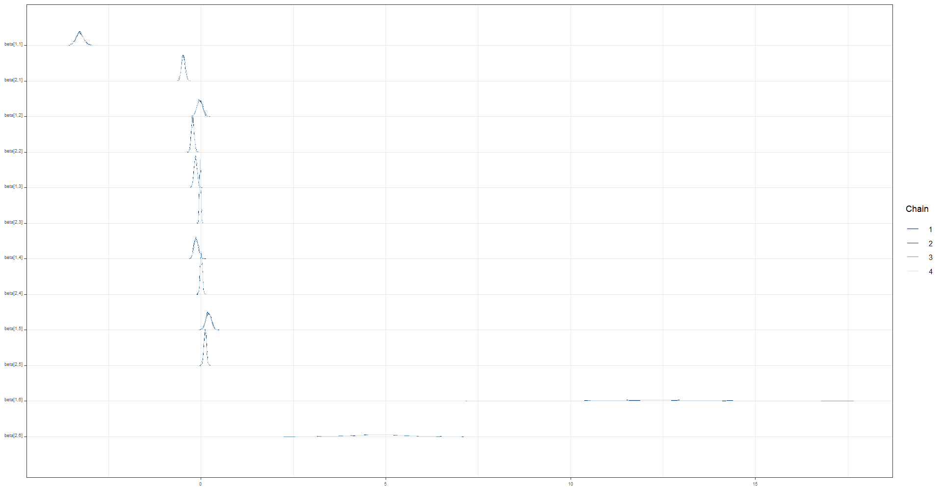 | beta[1,4] | -0.1329 | 0.0014 | 0.0633 | -0.2567 | -0.1755 | -0.1335 | -0.0906 | -0.0073 | 1942.175 | 1.0018 |