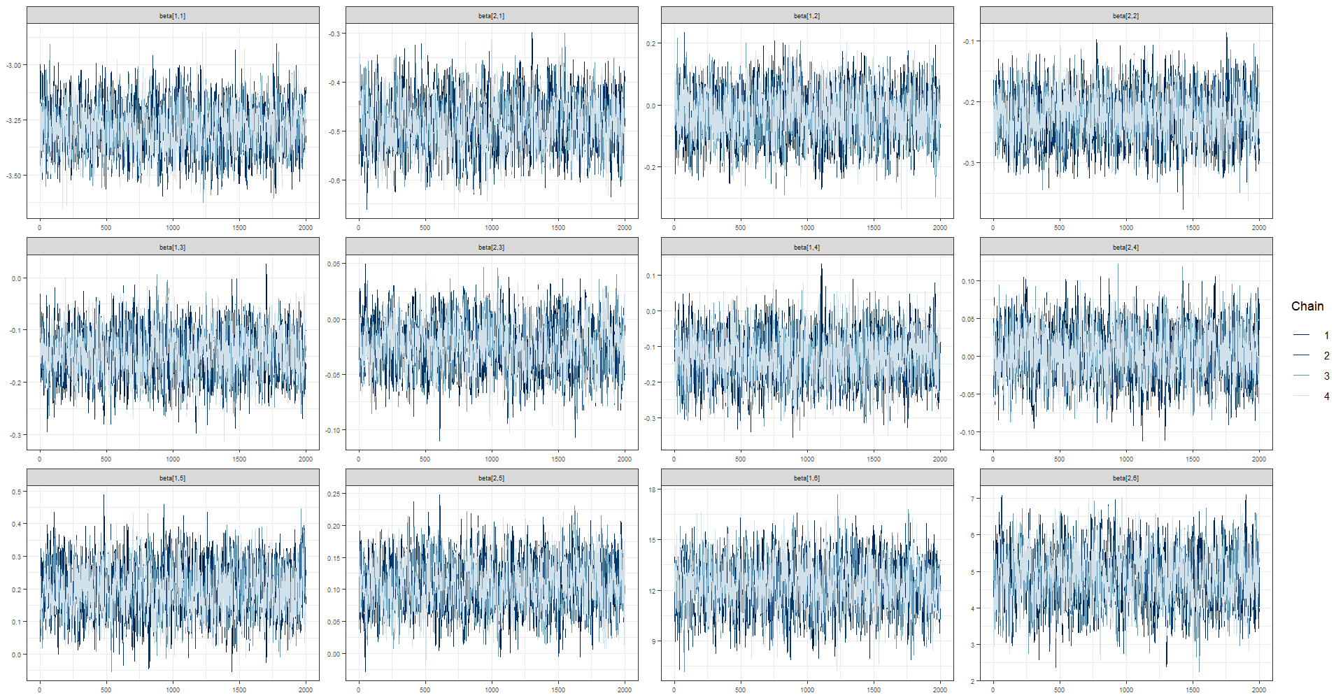 | beta[2,4] | 0.0041 | 0.0008 | 0.0309 | -0.0570 | -0.0170 | 0.0042 | 0.0253 | 0.0642 | 1682.866 | 1.0047 |